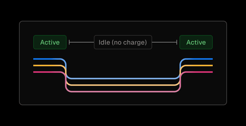 await sandbox.stop();Fluid compute automatically handles the unpredictable, long-running compute patterns that agents create. It’s easy to ignore compute when agents are processing text, but when usage scales and you add data-heavy workloads for files, images, and video, cost becomes an issue quickly. Fluid compute automatically scales up and down based on demand, and you're only charged for compute time, keeping costs low and predictable.