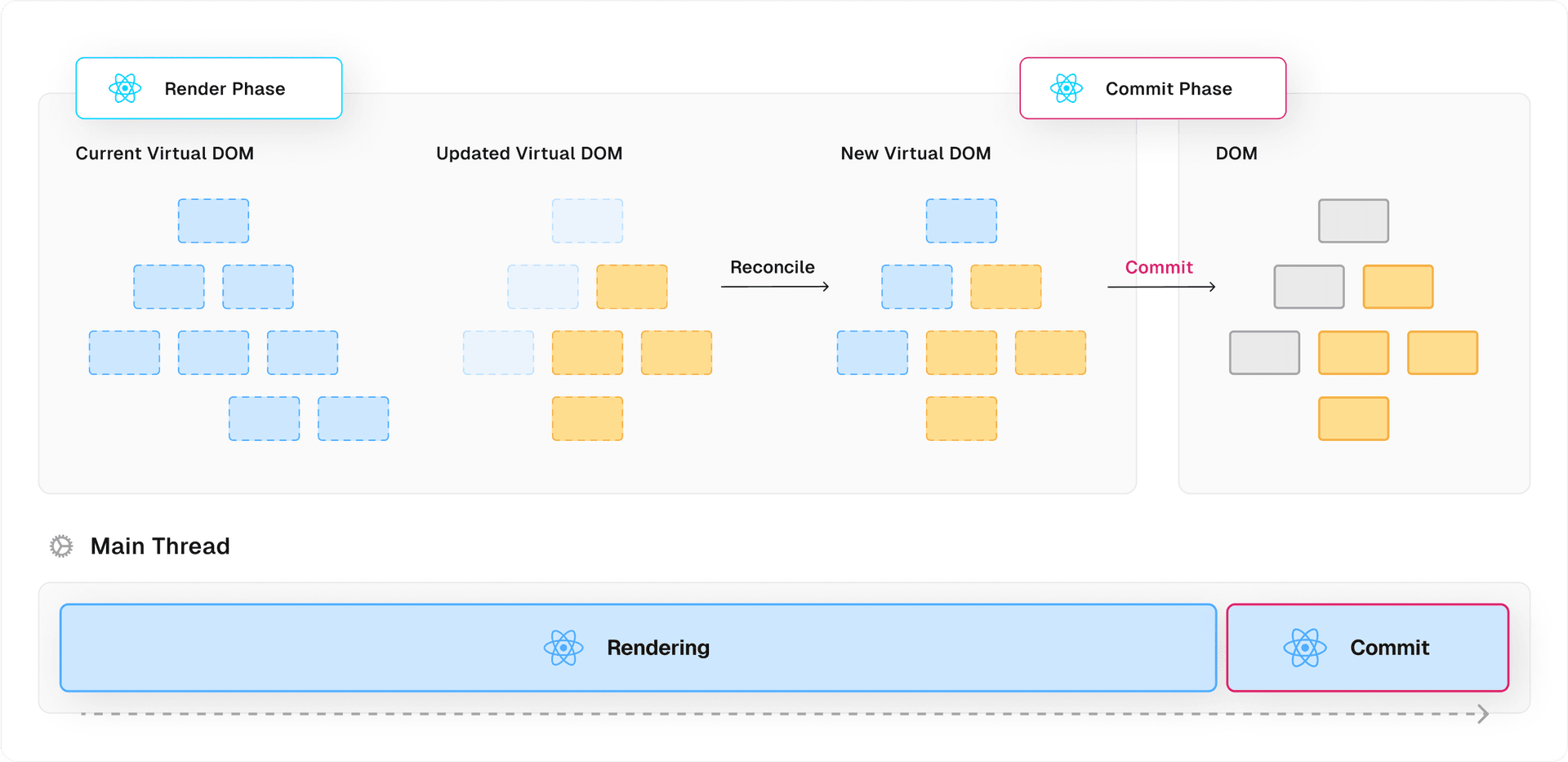 A synchronous render is an “all-or-nothing” operation, where it’s guaranteed that a component that starts rendering will always finish. Depending on the complexity of the components, the render phase could take a while to complete. The main thread is blocked during this time, meaning that users trying to interact with the application experience an unresponsive UI until React has completed the render and committed the result to the DOM.