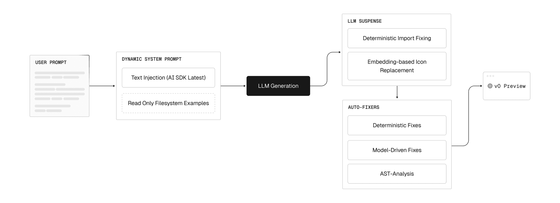Last year we introduced the v0 Composite Model Family, and described how the v0 models operate inside a multi-step agentic pipeline. Three parts of that pipeline have had the greatest impact on reliability. These are the dynamic system prompt, a streaming manipulation layer that we call “LLM Suspense”, and a set of deterministic and model-driven autofixers that run after (or while!) the model finishes streaming its response.