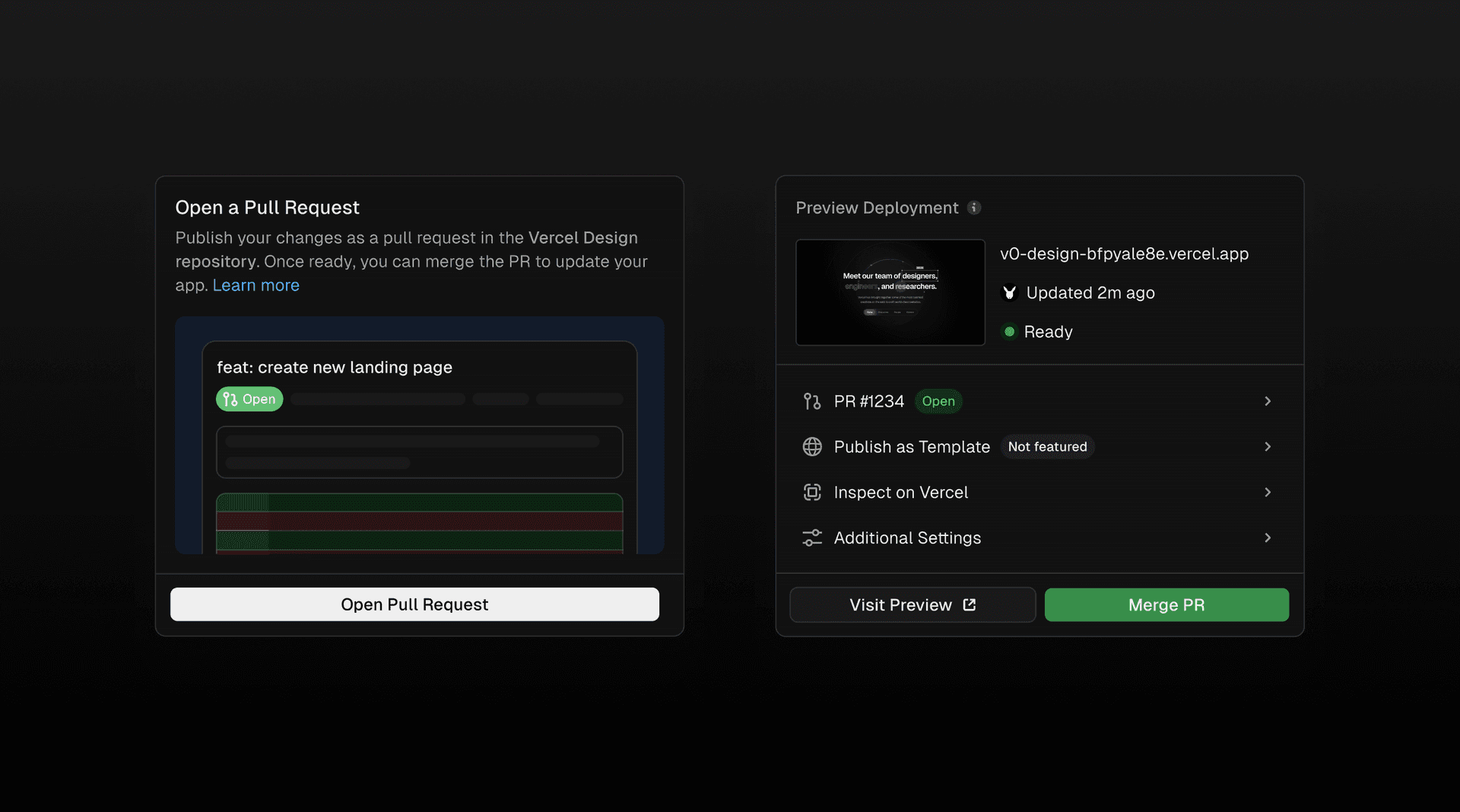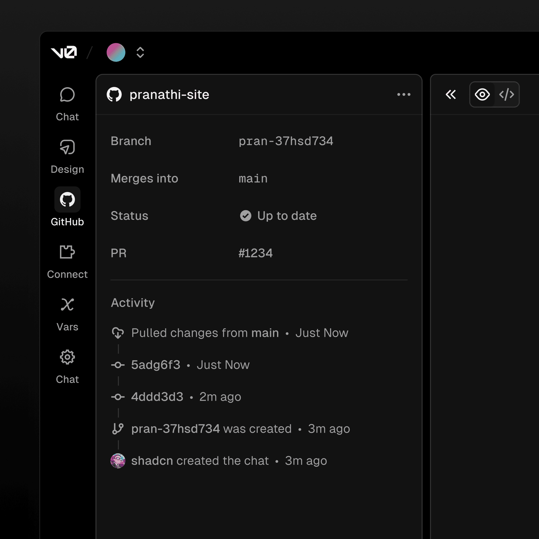 A new Git panel lets you create a new branch for each chat, open PRs against main, and deploy on merge. Pull requests are first-class and previews map to real deployments. For the first time, anyone on a team, not just engineers, can ship production code through proper git workflows.