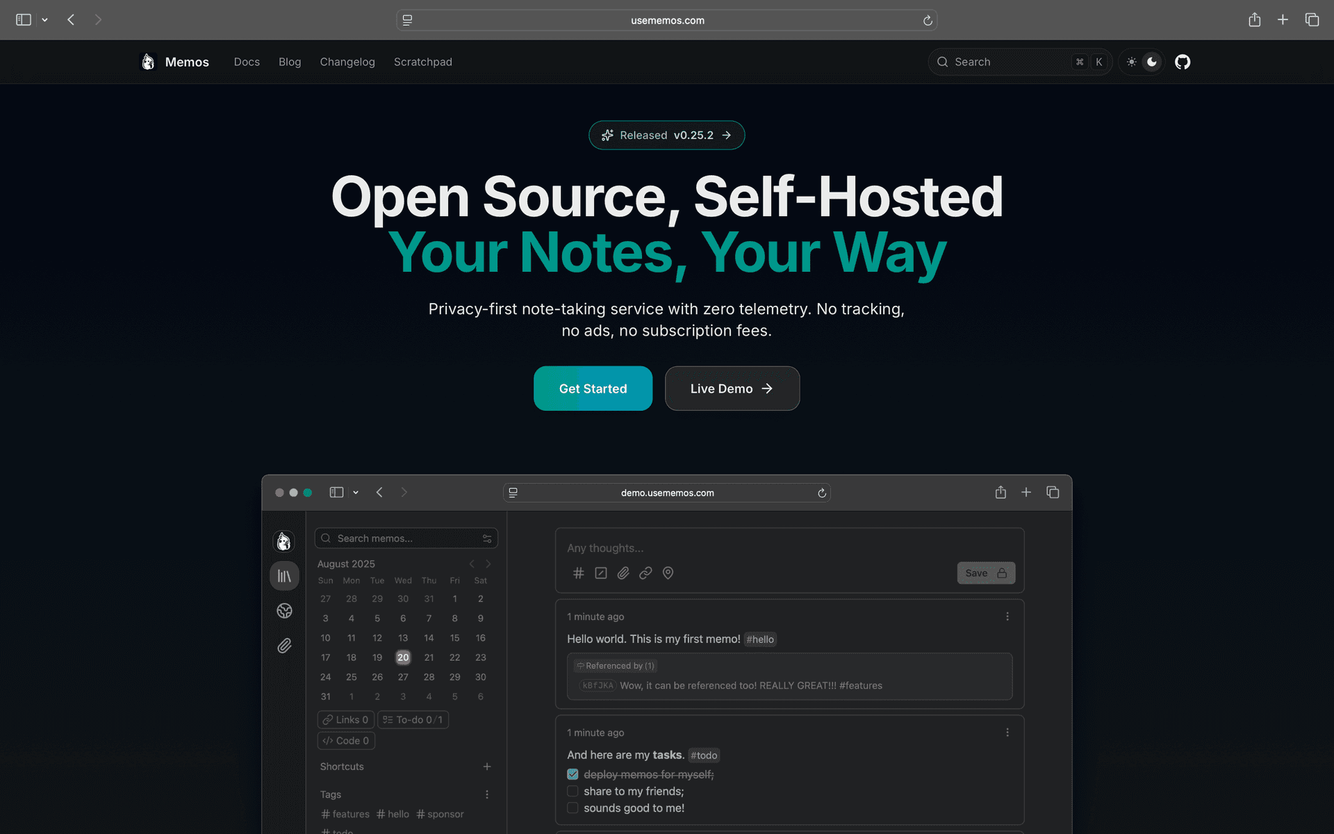 Memos is an open-source, self-hosted note-taking platform focused on simplicity and privacy, empowering developers and creators to capture and share knowledge without relying on cloud services. The project has grown to 44K+ GitHub stars, 400+ contributors, and a highly active global community.