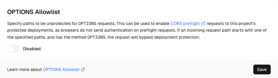 When you add a path to OPTIONS Allowlist, any incoming request with the method OPTIONS that starts with the path will no longer be covered by Deployment Protection. When you remove a path from OPTIONS Allowlist, the path becomes protected again with the project's Deployment Protection settings.